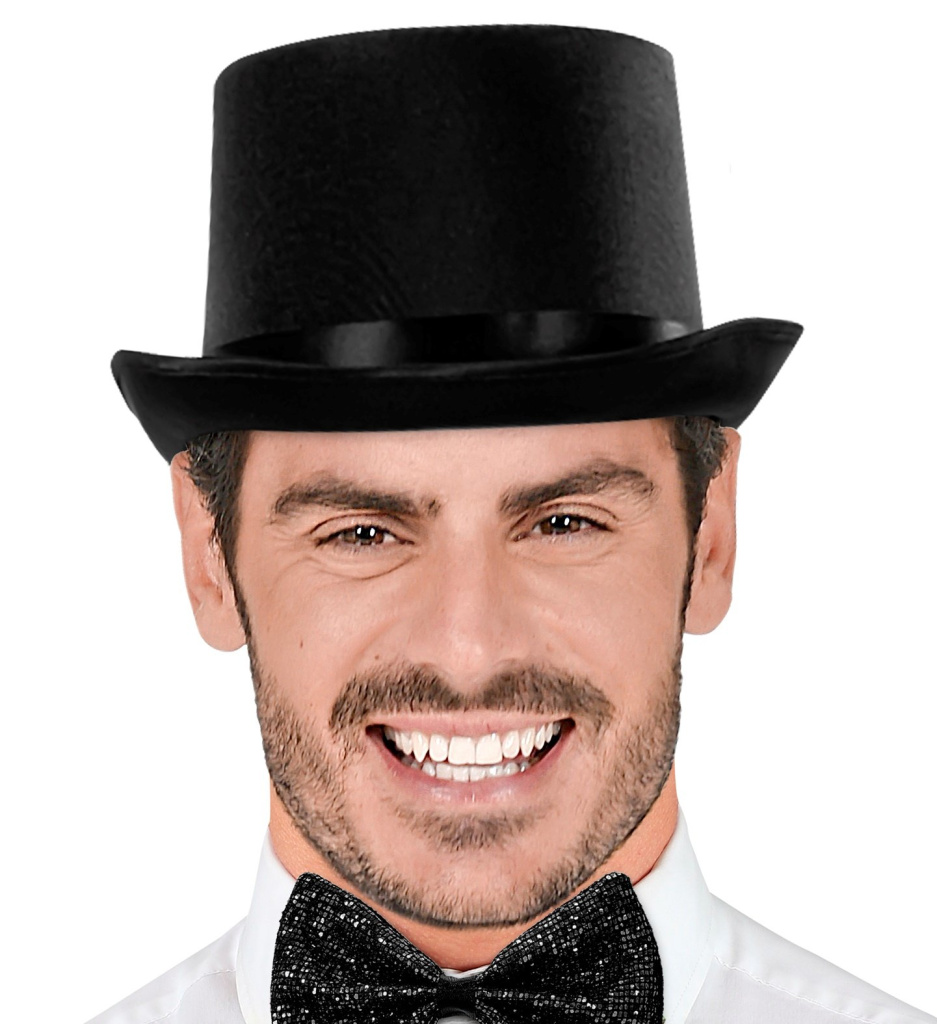 Cylindr saténový černý se stuhou krásný klobouk cylindr potažený saténem prošitý a olemovaný ze stužkou od společnosti Widmann. Více informací
