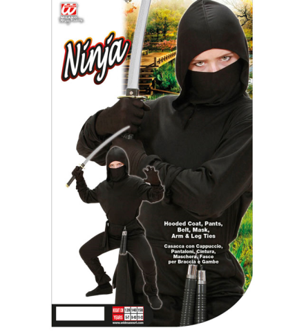 Bojovník Ninja je velmi oblíbený kostým pro děti. Obsahuje vrchní díl s dlouhým rukávem a kapucí, kalhoty, pás, masku a omotávky na ruce a nohy. Ostatní doplňky jako nunchaku (nunčaky) a ninja meč nejsou součástí a můžete je zakoupit zde.